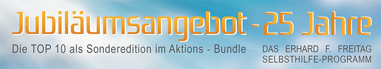 Über 500.000 Menschen nutzen schon die Möglichkeiten ihres Unterbewusstseins mit dem Selbsthilfe-Programm von Erhard F. Freitag. Heute bieten wir Ihnen eine Sonderedition zum 25 jährigen Jubiläum dieses Programmes an. Die TOP 10 Bestseller erhalten Sie zu einem sensationellen Jubiläumspreis von 98,- €. Sie sparen € 100,- So können Sie auch das eine oder andere Programm als Geschenk für einen lieben Menschen nutzen.